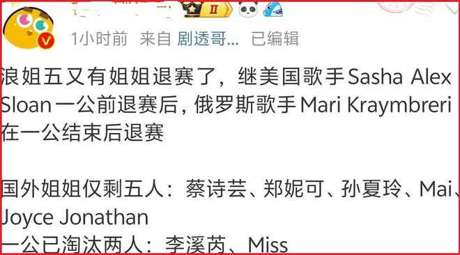 临近一公录制前夕,美国姐姐sasha退赛,如今俄罗斯姐姐mari一公后退赛,不少网友调侃这季节目是“退赛季”。
