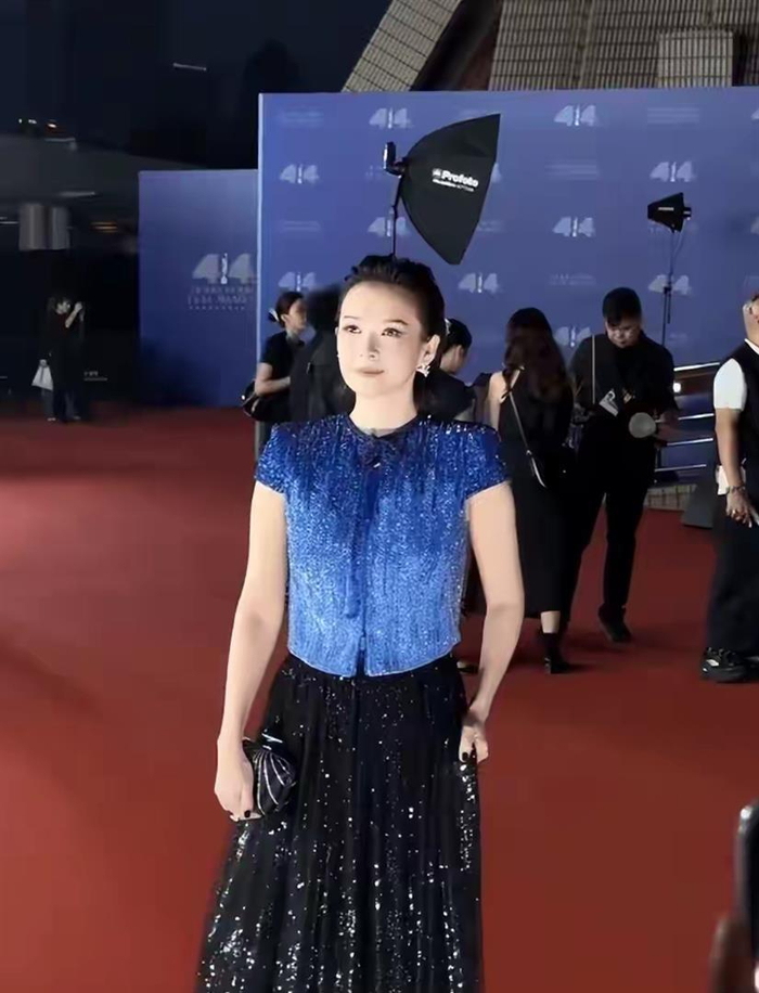 章子怡出现的时候,红毯已经进行了一个多小时。她剪了利落的齐耳短发,穿的是阿玛尼2026春夏系列的蓝色亮片露背上衣,搭配同品牌2025秋冬系列的黑色亮片长裙。转身时,礼服背后的大面积镂空设计完全露出来,冷白的皮肤在闪光灯下反着光。她今年46岁,凭《酱园弄·悬案》第五次提名金像奖最佳女主角。